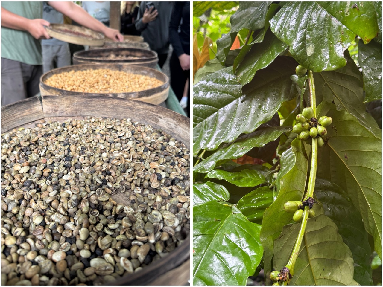 Nach der Mount Batur Wanderung war unser Ausflug aber noch nicht zu ende. Als nächster Stopp hielten wir bei einer Kaffee und Teeplantage. Dort wurden wir erstmal herumgeführt mit anschliessendem Kaffee und Tee tasting. Wenn man nach Bali kommt, hört man bestimmt irgendwann von dem berühmten Luwak Kaffee. Die Besonderheit daran ist, dass die Kaffeebohnen von der Schleichkatze „Luwak“ ausgeschieden wurden. Durch den Verdauungsprozess werden die Kaffeebohnen fermentiert und es werden so die Bitterstoffe genommen. Zudem essen die Tiere nur besonders reife und gute Kaffeekirschen was den Kaffee am ende noch qualitativ besser machen soll. Beim Kaffeetasting war der Luwak Kaffee nicht inklusive da dies als der teuerste Kaffee der Welt gilt. Man konnte sich aber eine Tasse bestellen was auch jemand von unserer Gruppe gemacht hat. Wir alle fanden den Kaffee wirklich lecker und kaum bitter obwohl er kein Zucker drin hatte.