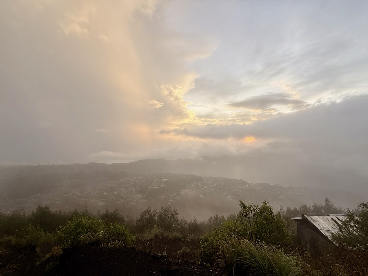 Als nächstes ist es sehr bekannt zum Sonnenaufgang auf den Mount Batur zu wandern. Hierzu sollte man sich eine Tour buchen damit man einen Bergführer hat. Für die Tour wurden wir um 03:00 Uhr abgeholt. Wir fuhren dann zuerst etwa 40 Minuten bis zu einem Ort wo wir Kaffee und frittierte Bananen zum Frühstück bekommen haben. Dann ging es weiter bis zum Fusse des Mount Batur. Dort bekamen wir unsere Stirnlampen und dann ging es auch schon los. Die Wanderung nach oben dauerte nur eine Stunde. Da der Boden aus Lavageröll besteht, ist es relativ rutschig, man sollte also gutes Schuhwerk tragen. Am besten nimmt man auch noch etwas warmes zum drüberziehen mit, denn auf dem Mount Batur ist es morgen um die 15 Grand mit Wind. Da wir während der Regenzeit da waren, haben wir leider nicht besonders viel vom Sonnenaufgang gesehen weil es sehr neblig war. Oben haben wir dann nochmals ein einfaches Frühstück bekommen aus Toastbrot und Bananen.
