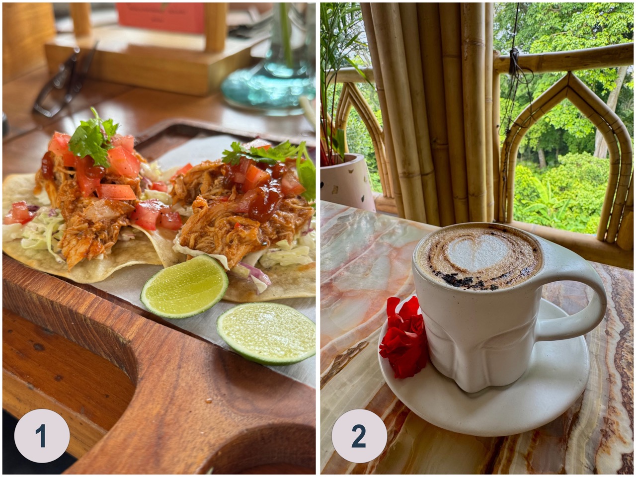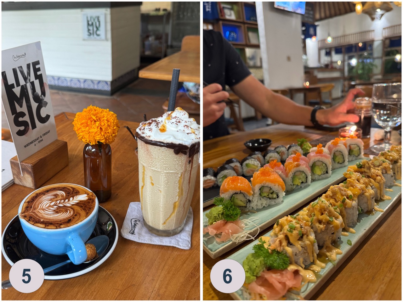 In Ubud hat es unglaublich viele Kaffees und Restaurants die meist sehr westlich angepasst sind. Das ist wohl auch der Grund warum sich Bali grosser Beliebtheit bei digitalen Nomaden erfreut. Es gibt nebst den vielen westlichen Restaurants aber auch viele Warungs die traditionelle Speisen anbieten. Dass es so viele unterschiedliche Optionen für Essen und Getränke gibt ist auch der Grund warum sehr viel Wert auf Google Rezessionen gelegt wird. Ab und zu bekommt man deshalb ein gratis Getränk oder ein kleines Extra, mit der Bitte eine Google Rezension zu schreiben. Das führt leider dazu, dass die Bewertungen nicht immer neutral sind und man sich nicht 100% darauf verlassen kann. Folgende Kaffes und Restaurants kann ich sehr empfehlen. Bei den Restaurants 1-5 kann man sowohl Frühstücken und Kaffee trinken und auch Mittag,- und Abendessen bekommen. Die Nummer 6 ist ein reines Sushirestaurant ohne Frühstücksoptionen.