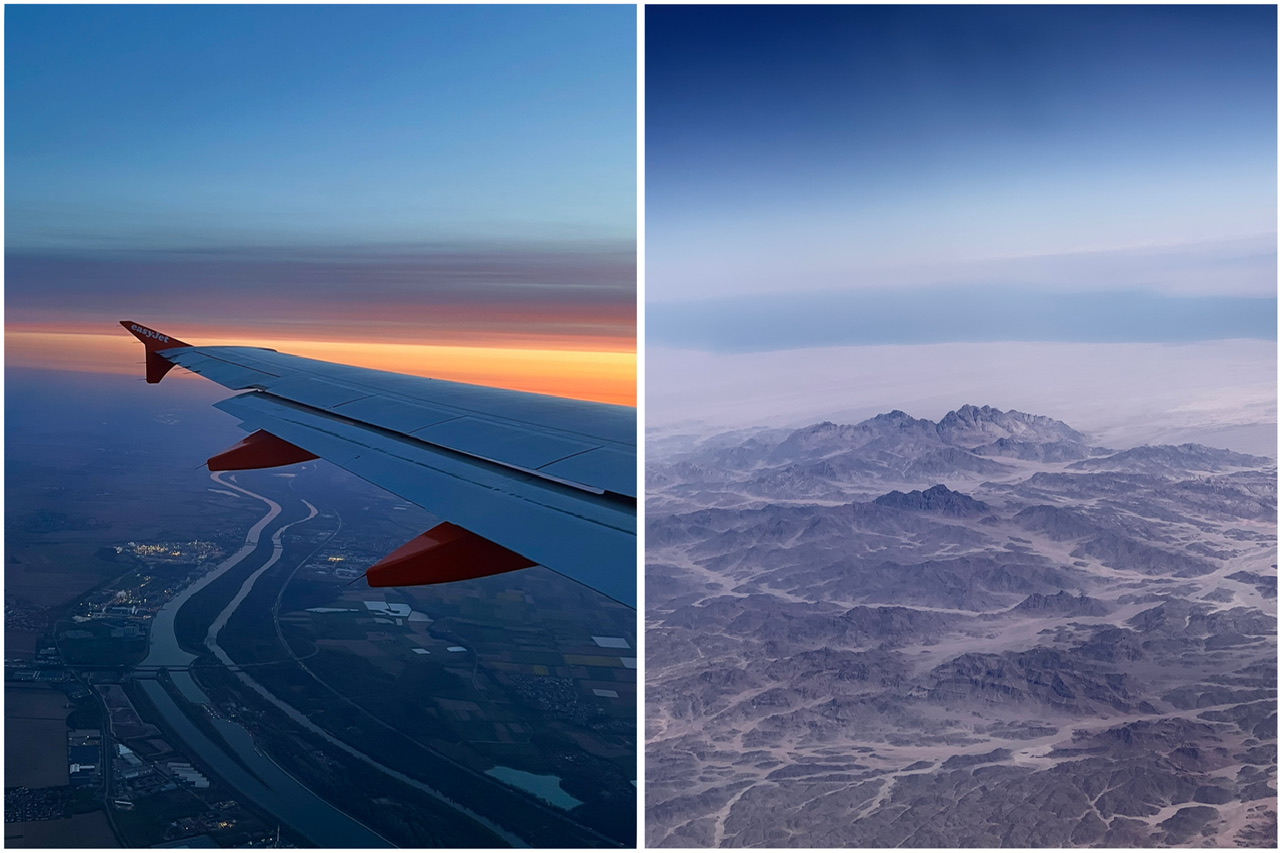 Gestartet haben wir unsere Reise am Bahnhof Luzern. Wir fuhren nach Saint-Louis, was direkt an der Schweizer Grenze in Frankreich liegt. Dort haben wir ein Air BnB gemietet, da unser Flugzeug am nächsten Morgen bereits um 6 Uhr ab Basel startete. Da jedoch zu dieser Uhrzeit noch kein Zug fuhr, organisierten wir uns vorab noch ein Taxi, was problemlos klappte, nach ein paar Verständigungsproblemen. Am Flughafen angekommen, war noch alles sehr leer. Wir hatten genug Zeit, gemütlich noch etwas zu essen, bevor es dann zum Boarding ging. Das Flugzeug war von EasyJet und es hat alles super geklappt. Vom Flugzeug aus konnten wir am Anfang den Sonnenaufgang schauen und über Ägypten sahen wir die Wüste und Berge. Vor der Ankunft am Flughafen Hurghada bekamen wir noch ein Papier, das wir ausfüllen mussten für die Einreise nach Ägypten. Ansonsten muss man nichts Besonderes vorbereiten. Das Visum kann man dann vor Ort am Flughafen für 20 Euro kaufen.
