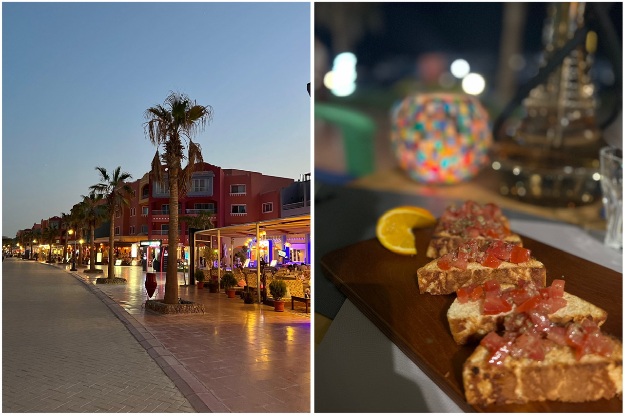 Vom Hotel aus fuhren wir einen Nachmittag/Abend in die Stadt Hurghada. Normalerweise ist man in Ägypten in einem All-inclusive-Hotel, jedoch wollten wir sehen, wie das Land ausserhalb der Hotelanlage ist. Vom Taxifahrer haben wir die Weisung bekommen, in der Stadt nicht weiter als zu einem bestimmten Punkt zu gehen, weil es danach gefährlich werden würde. Diesen Eindruck können wir aber nicht bestätigen. Es gibt in der Stadt viele Shops, wo man Kleider, Gewürze und Souvenirs kaufen kann. Als wir Geld abheben wollten, wurde es jedoch ein bisschen schwierig. Mehrere Bankomaten hatten kein Geld mehr drin. Am besten hebt man das Geld bei einem Bankomat im Hotel ab, dort hatten wir nie Probleme. Ein sehr schöner Ort in der Stadt ist der Marina Hurghada. An der Uferpromenade gibt es verschiedenste Restaurants.