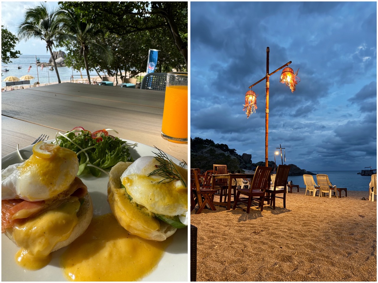 Da wir bei unserer Buchung bereits das Frühstück inklusive gebucht hatten, konnten wir jeden Morgen von einer Menuekarte aussuchen und bekamen zusätzlich unterschiedliche Säfte und Wasser sowie Heissgetränke. Mein Lieblingsrestaurant war definitiv das Poseidon, welches ebenfalls Bungalows vermietet. Das gelbe Curry schmeckt unglaublich gut und es gibt noch diverse weitere thailändische Gerichte. Man kann an Tischen sitzen oder mit Blick aufs Meer auf gemütlichen Thaikissen, in Hängematten oder Liegestühlen. Die Einrichtung von diesem Restaurant ist wirklich toll und authentisch.