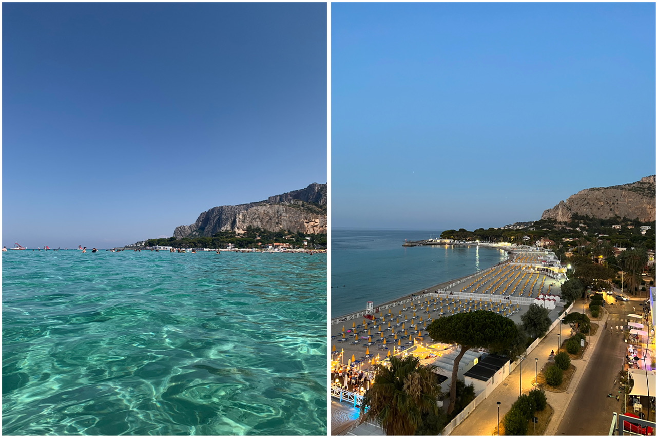 Doch nun zur Ankunft auf Sizilien. Beim Ausstieg aus dem Flugzeug schlug uns direkt die heisse, sommerliche Luft Siziliens ins Gesicht. Das Wetter war Mitte Juli einfach nur perfekt. Vom Flughafen fuhren wir mit einem Taxi zu unserer Unterkunft. Es war ein sehr einfaches Appartement in Mondello. Dafür war aber der Strand ca. 12 Meter entfernt. Man musste nur einmal die Strasse überqueren. Der Strand von Mondello gilt tatsächlich auch als einer der schönsten Strände Siziliens. Da ich während meines Aufenthalts auf Sizilien keine anderen Strände besucht habe, kann ich den Strand nicht vergleichen, aber ich kann es mir sehr gut vorstellen. Das Wasser war kristallklar, wie man auf dem Foto unten erkennen kann. Zudem konnte man Kilometerlang am Wasser spazieren. Weiter aussen tummelten sich Motorboote. Das Einzige, was schade war, ist, dass fast der gesamte Strand mit verschiedenen Anbietern von Liegestühlen besetzt ist. Diese unterschiedlichen Anbieter hatten Ihre Fläche jeweils auch mit Holzzäunen voneinander abgegrenzt, was dann eher nicht so idyllisch aussah. Zudem kostete ein Liegestuhl ca. 15 Euro pro Tag, was dann schon etwas viel ist wenn man das jeden Tag machen möchte. Man kann aber sein Badetuch vor den Zäunen direkt am Wasser platzieren, wenn man sich das Geld dafür sparen möchte.